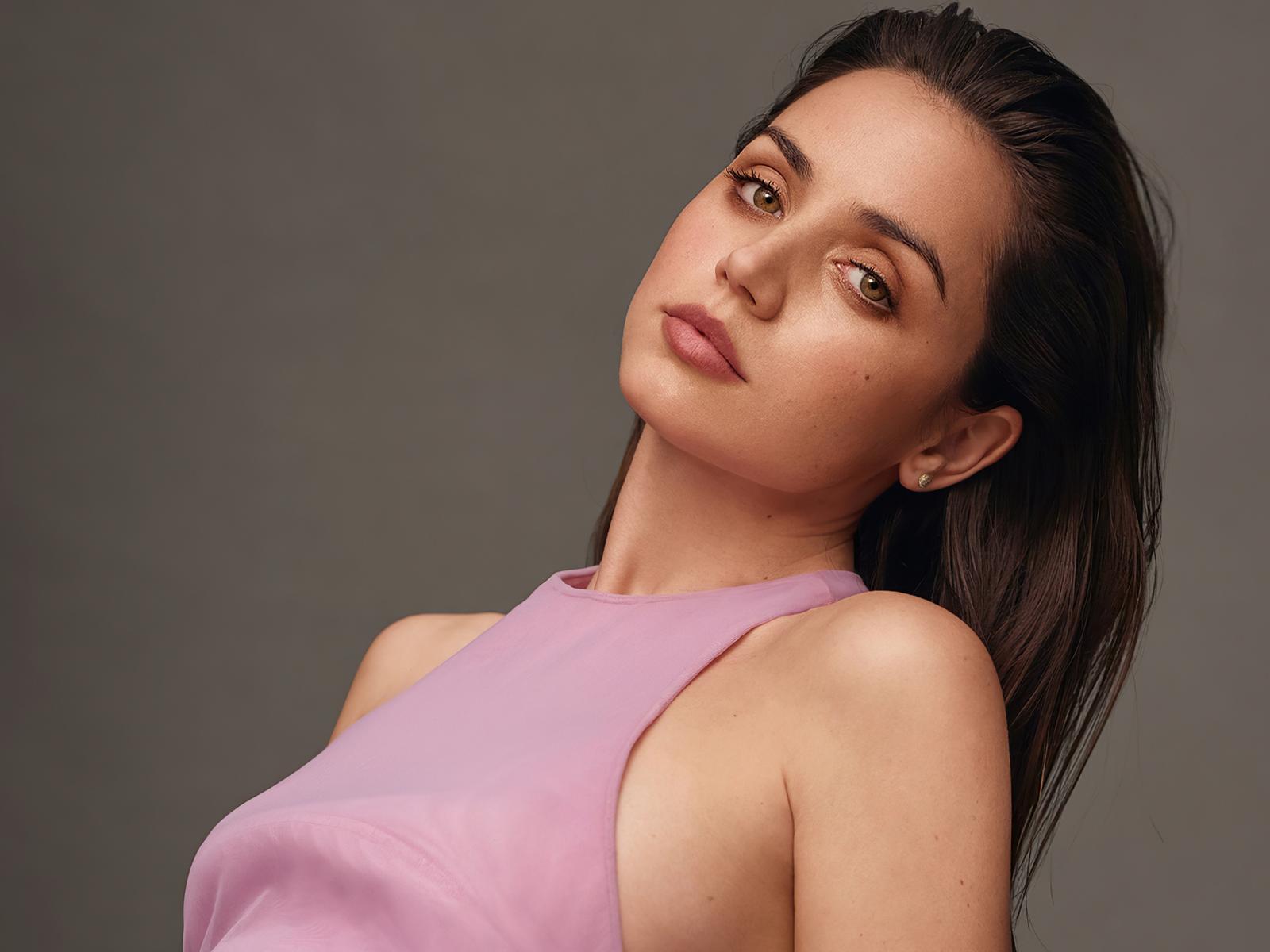 Обои Актриса Ана де Армас на сером фоне в розовой кофте