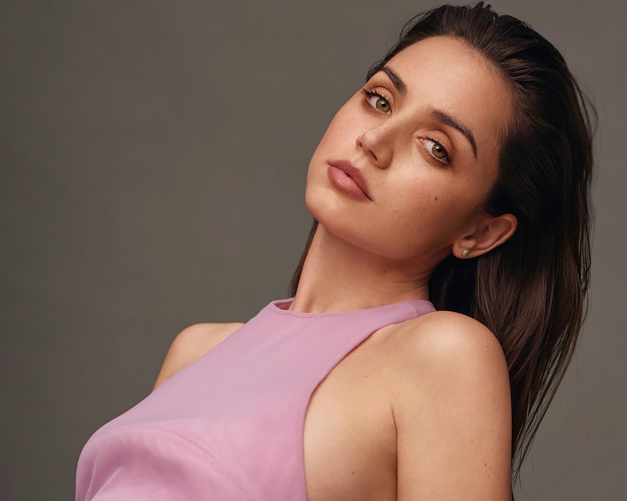 Обои Актриса Ана де Армас на сером фоне в розовой кофте