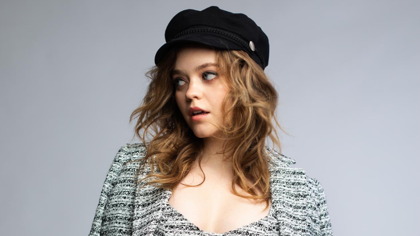 Обои Актриса Джэйд Петтиджон смотрит в сторону на сером фоне