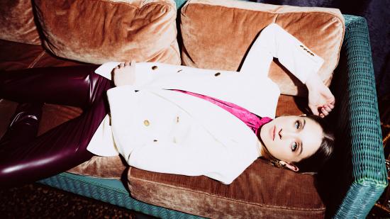 Обои Актриса Наталия Дайер лежит на диване
