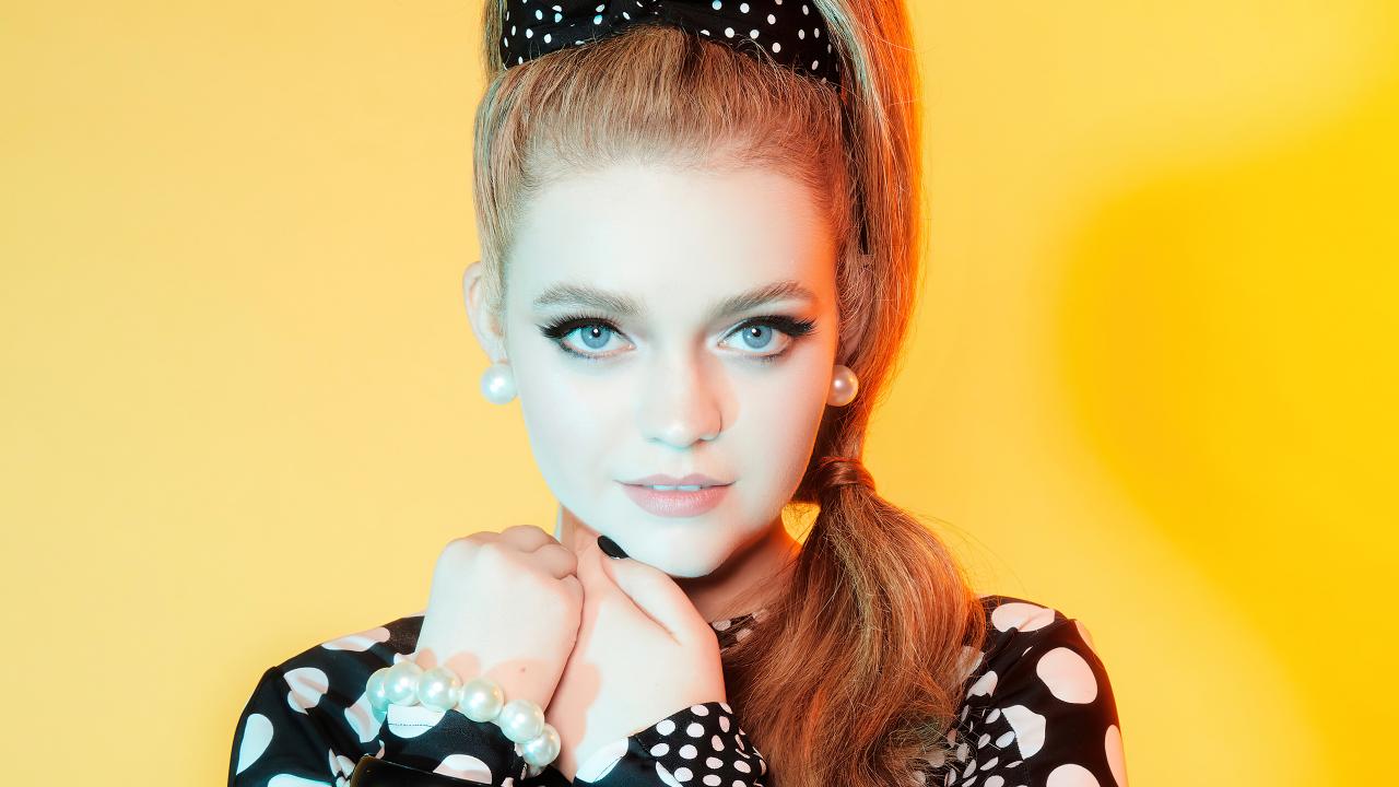 Обои Красивая голубоглазая девушка Джэйд Петтиджон на желтом фоне