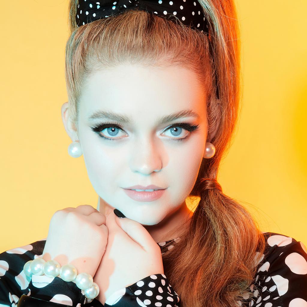 Обои Красивая голубоглазая девушка Джэйд Петтиджон на желтом фоне