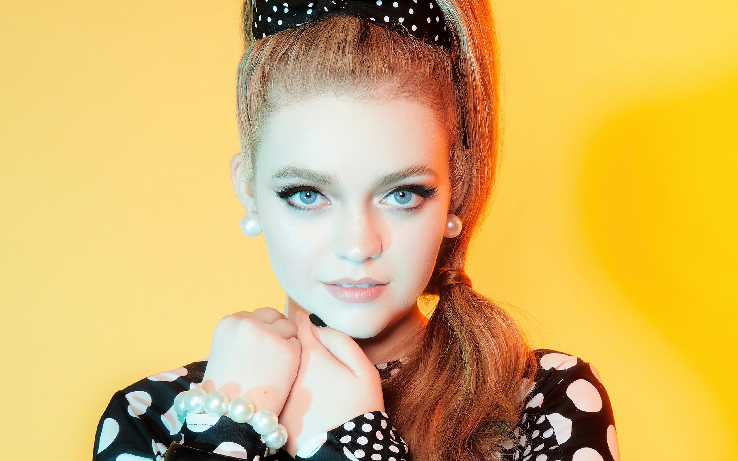 Обои Красивая голубоглазая девушка Джэйд Петтиджон на желтом фоне