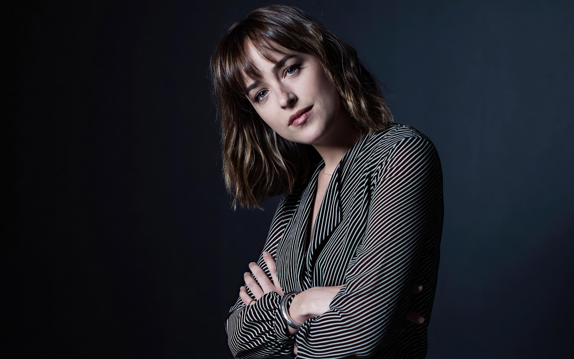Обои Красивая актриса Дакота Джонсон в полосатой рубашке
