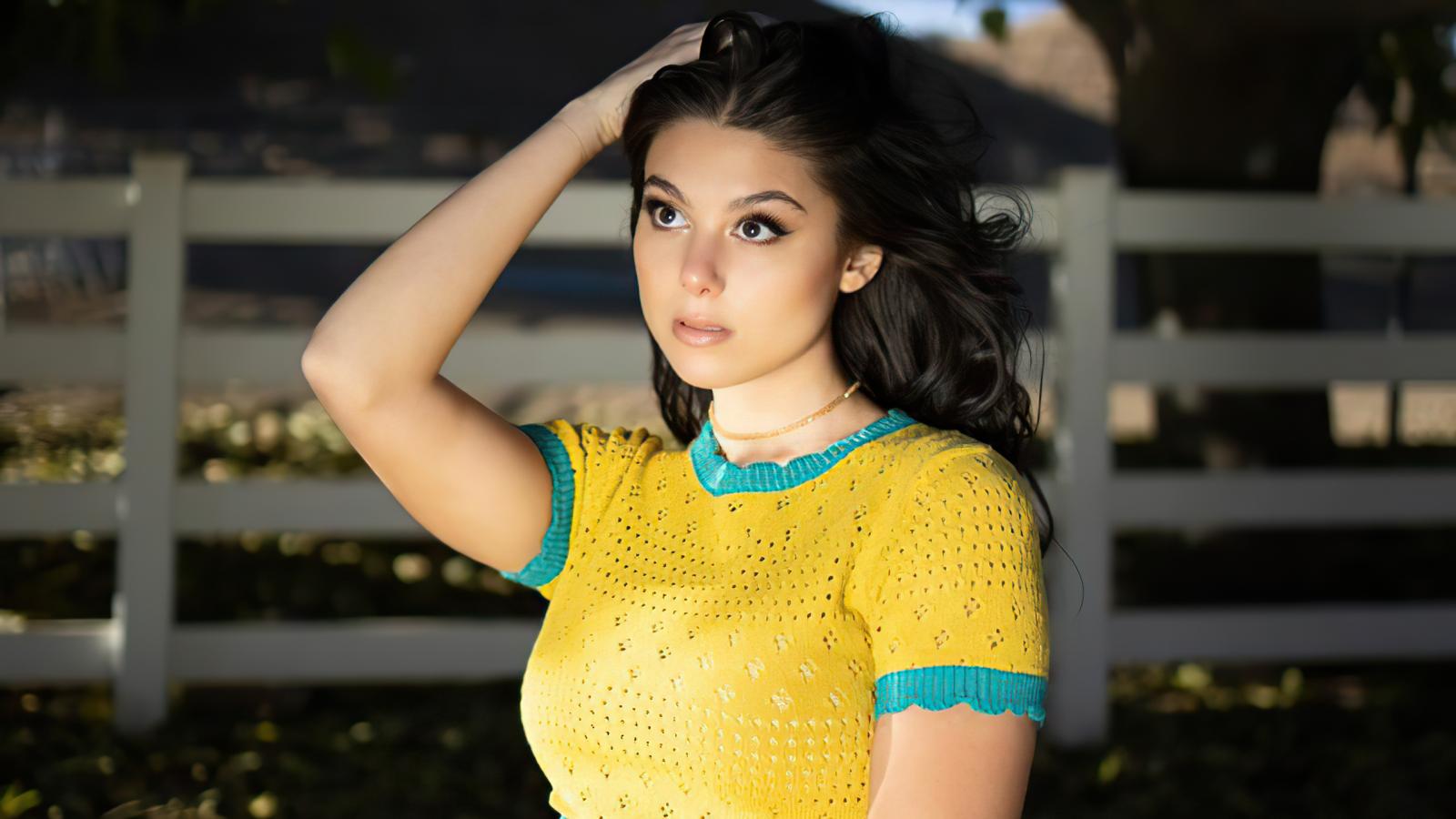 Обои Молодая американская актриса Кира Косарин с рукой в волосах