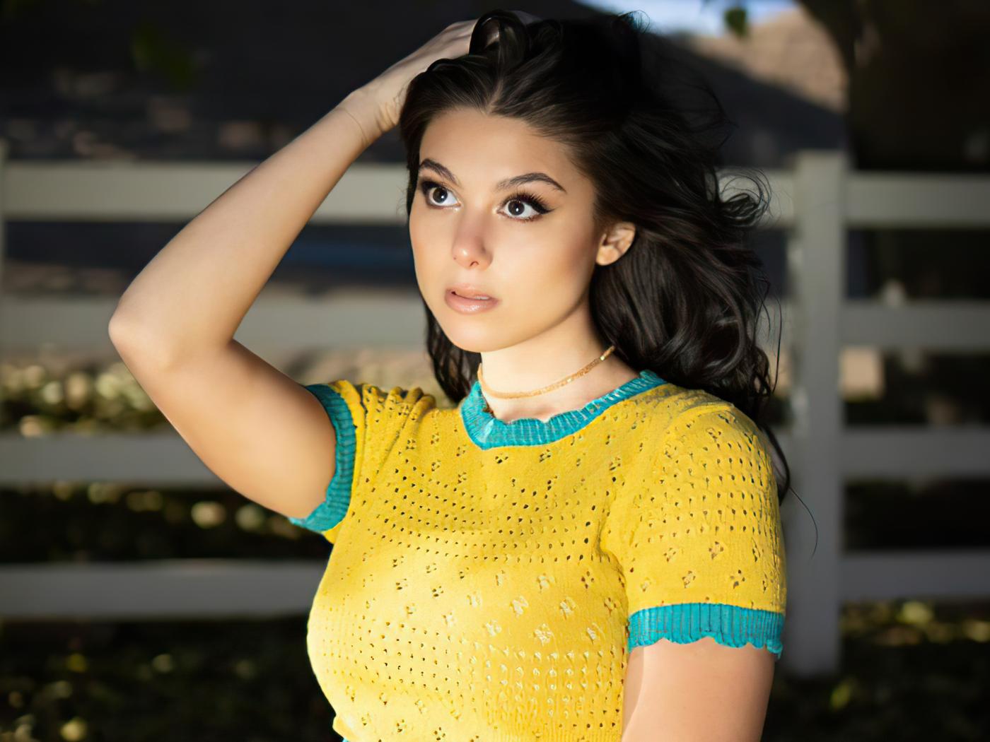 Обои Молодая американская актриса Кира Косарин с рукой в волосах