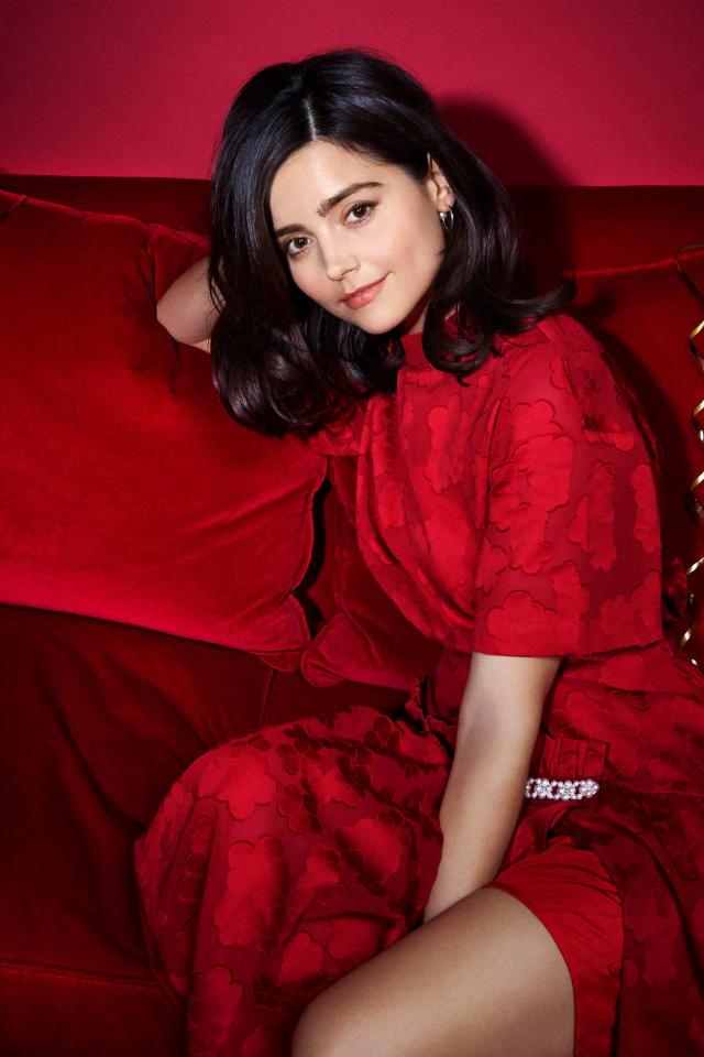 Обои Красивая британская актриса Дженна Коулман сидит на красном диване