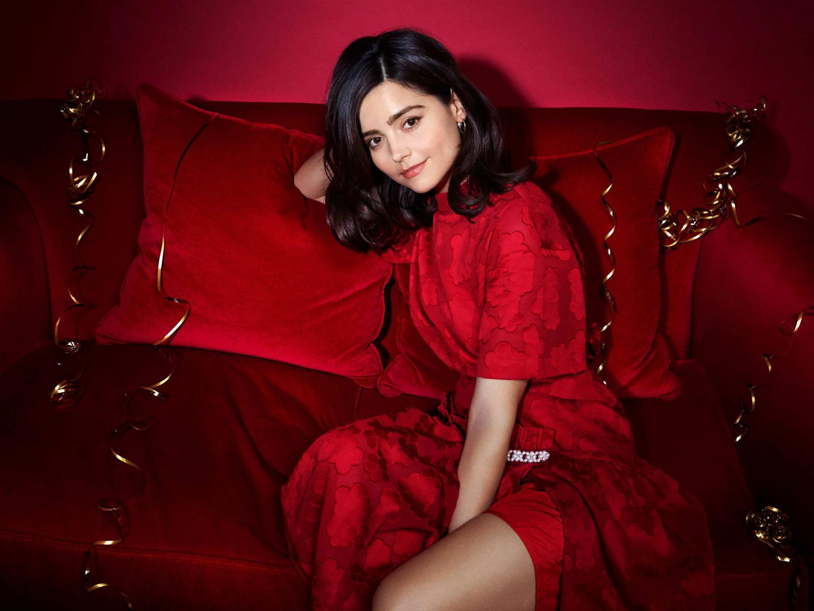 Обои Красивая британская актриса Дженна Коулман сидит на красном диване