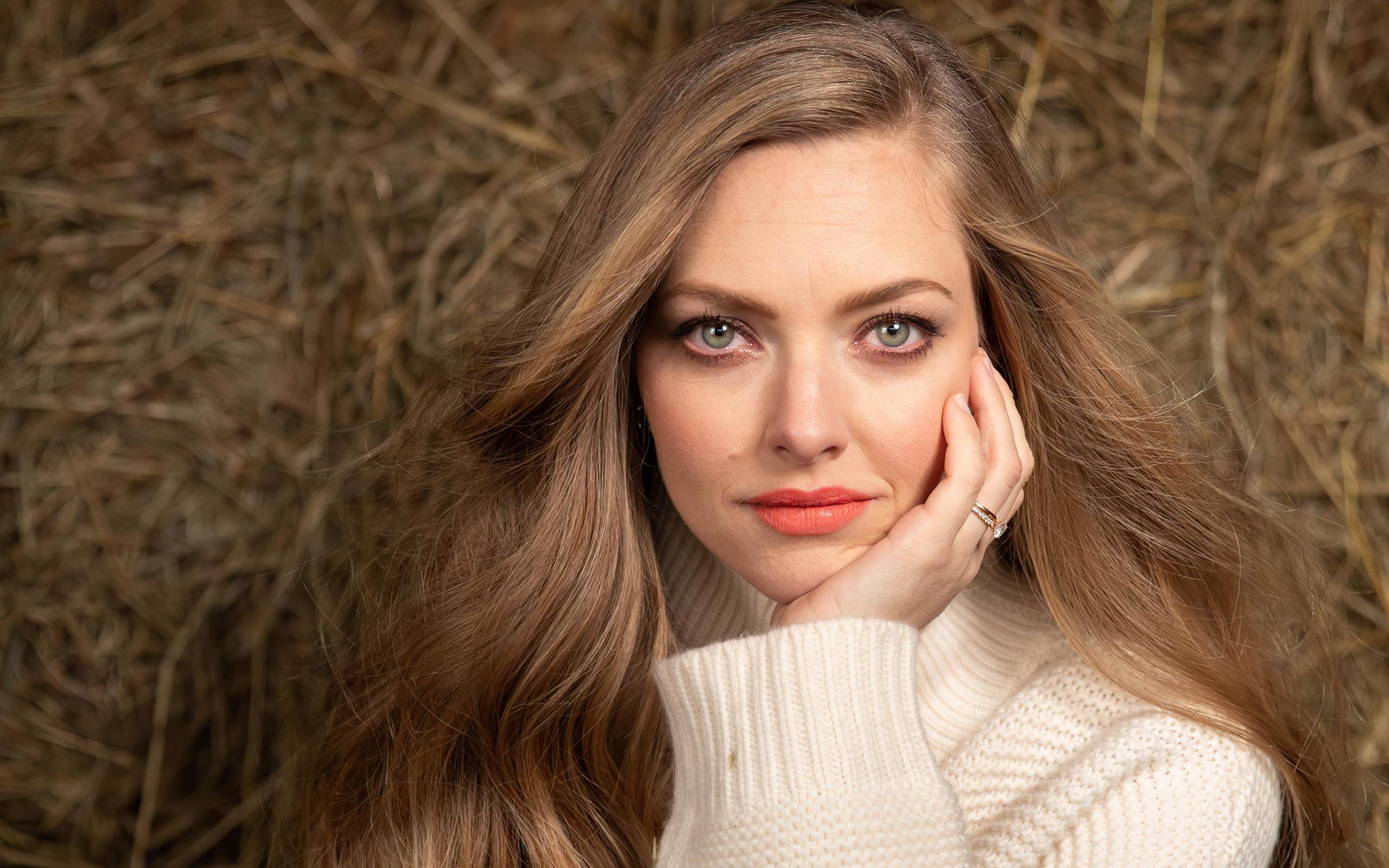 Обои Красивая милая девушка, актриса Аманда Сайфред в белом свитере