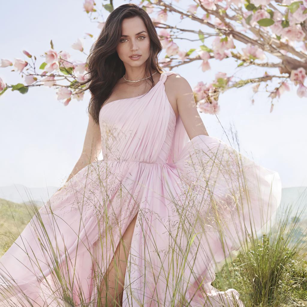 Обои Красивая девушка, актриса Ана де Армас в розовом платье у дерева