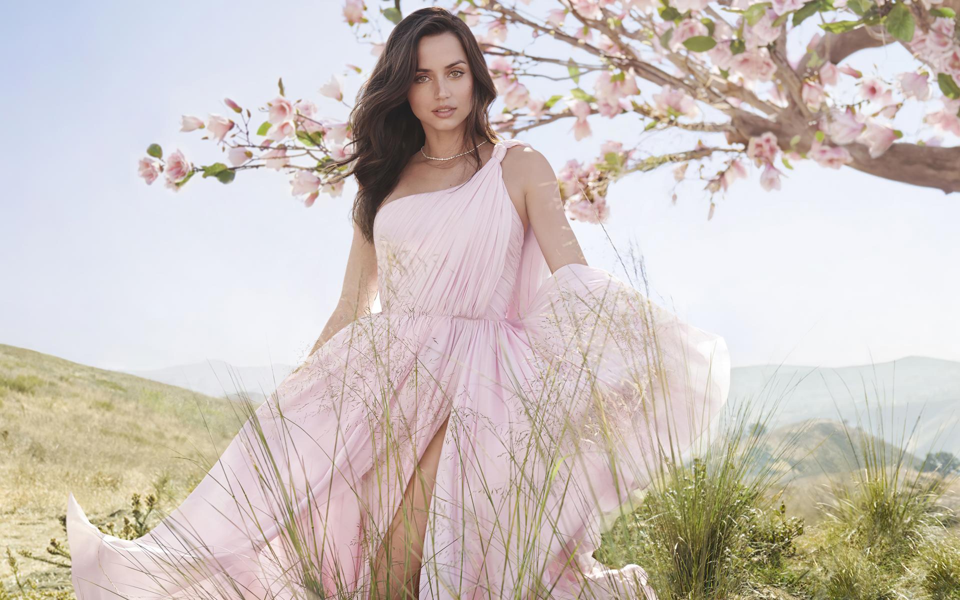 Обои Красивая девушка, актриса Ана де Армас в розовом платье у дерева