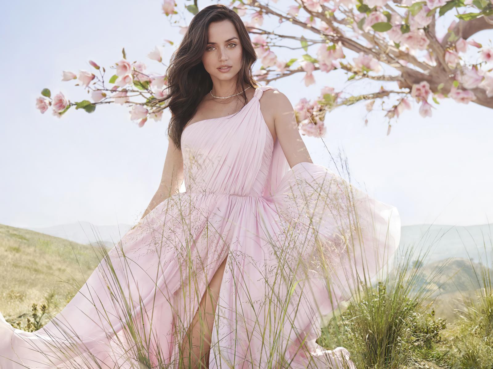 Обои Красивая девушка, актриса Ана де Армас в розовом платье у дерева