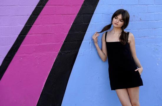 Обои Милая девушка актриса Сиэра Браво у разноцветной стены