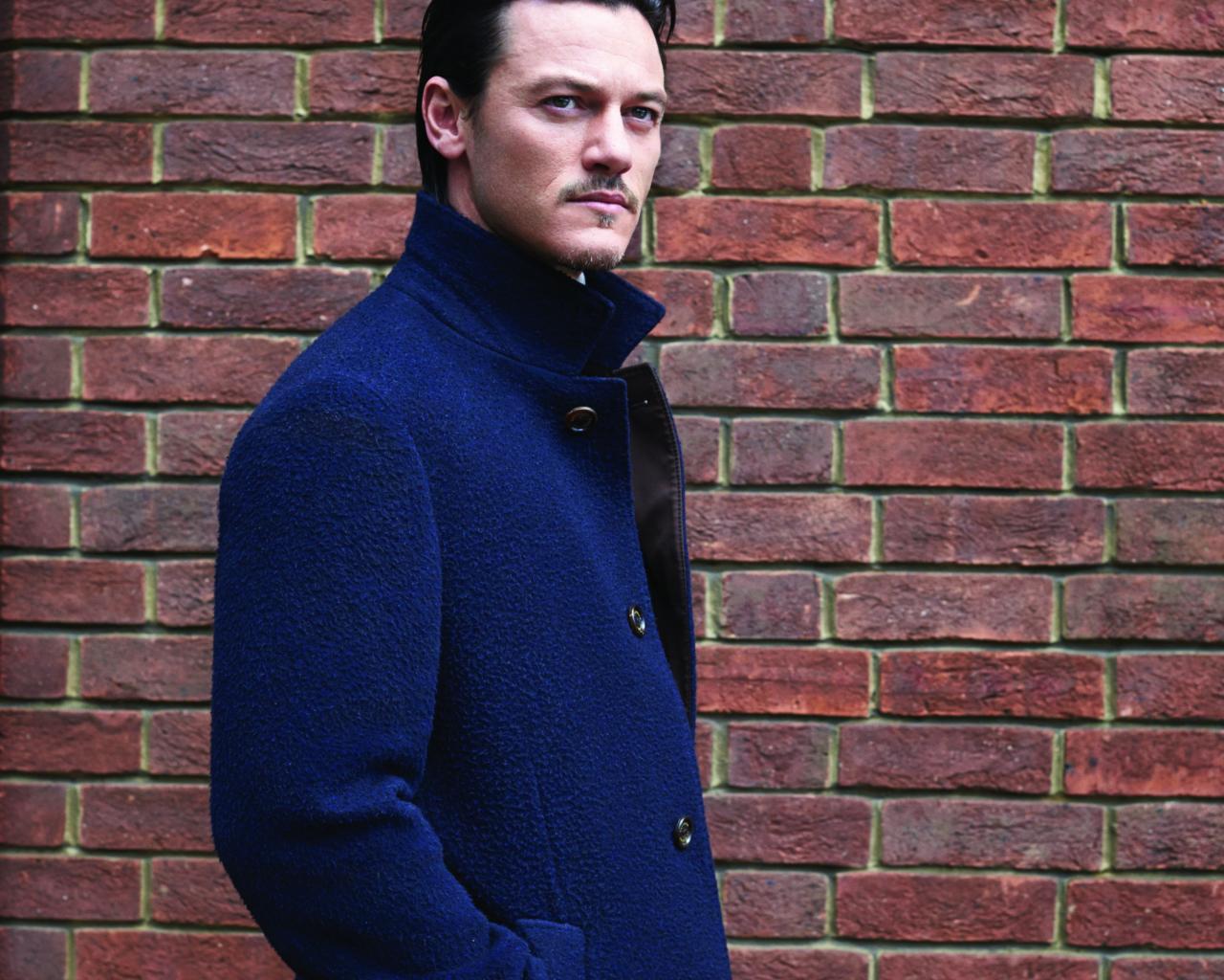 Обои Актер Люк Эванс в синем плаще у кирпичной стены