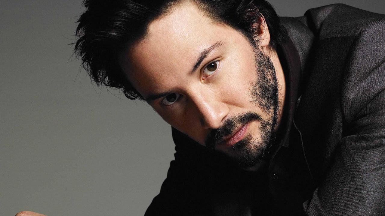 Обои Актер Киану Ривз в костюме на сером фоне