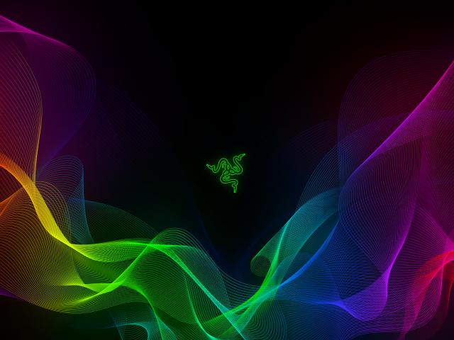 Обои Зеленый логотип Razer на черном фоне с разноцветной абстракцией