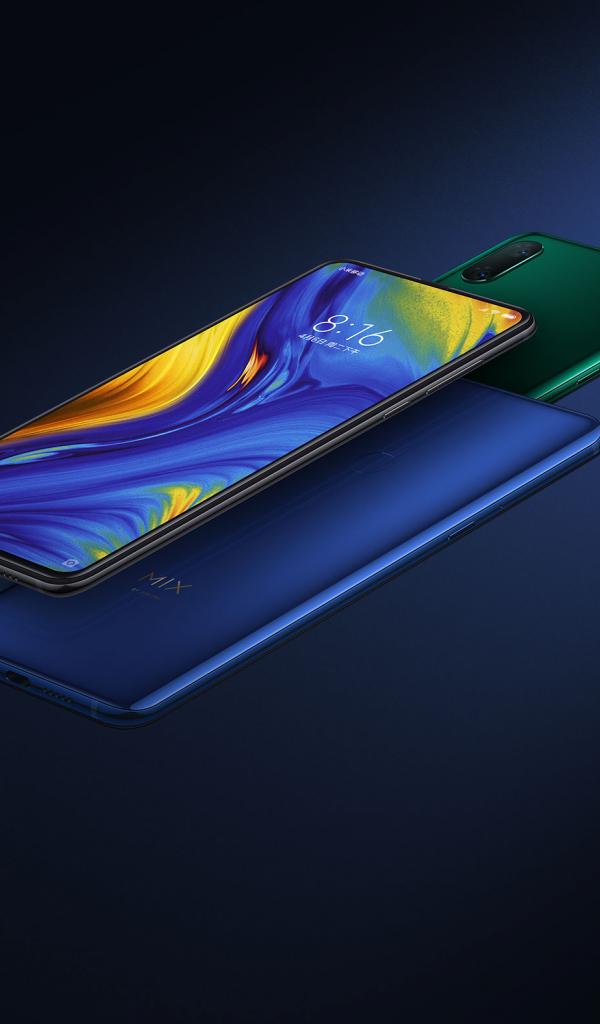 Обои Новый безрамочный смартфон слайдер Xiaomi Mi Mix 3 на синем фоне