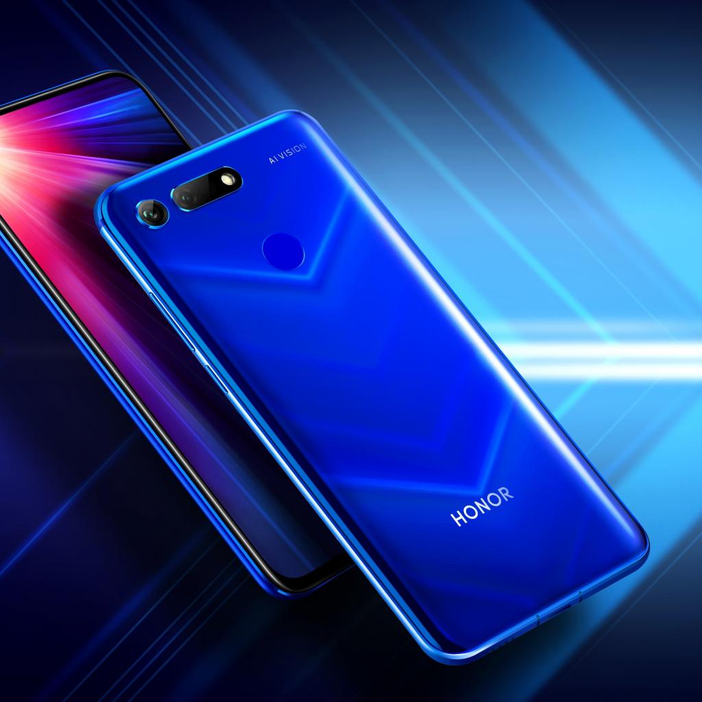 Обои Стильные смартфоны Honor View 20 на синем неоновом фоне
