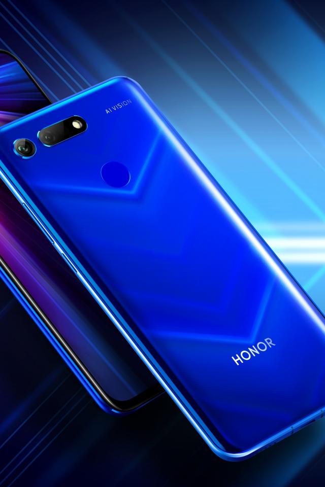 Обои Стильные смартфоны Honor View 20 на синем неоновом фоне