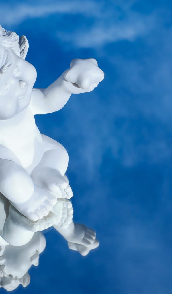 Обои Маленькая статуя купидона отражается в голубой поверхности
