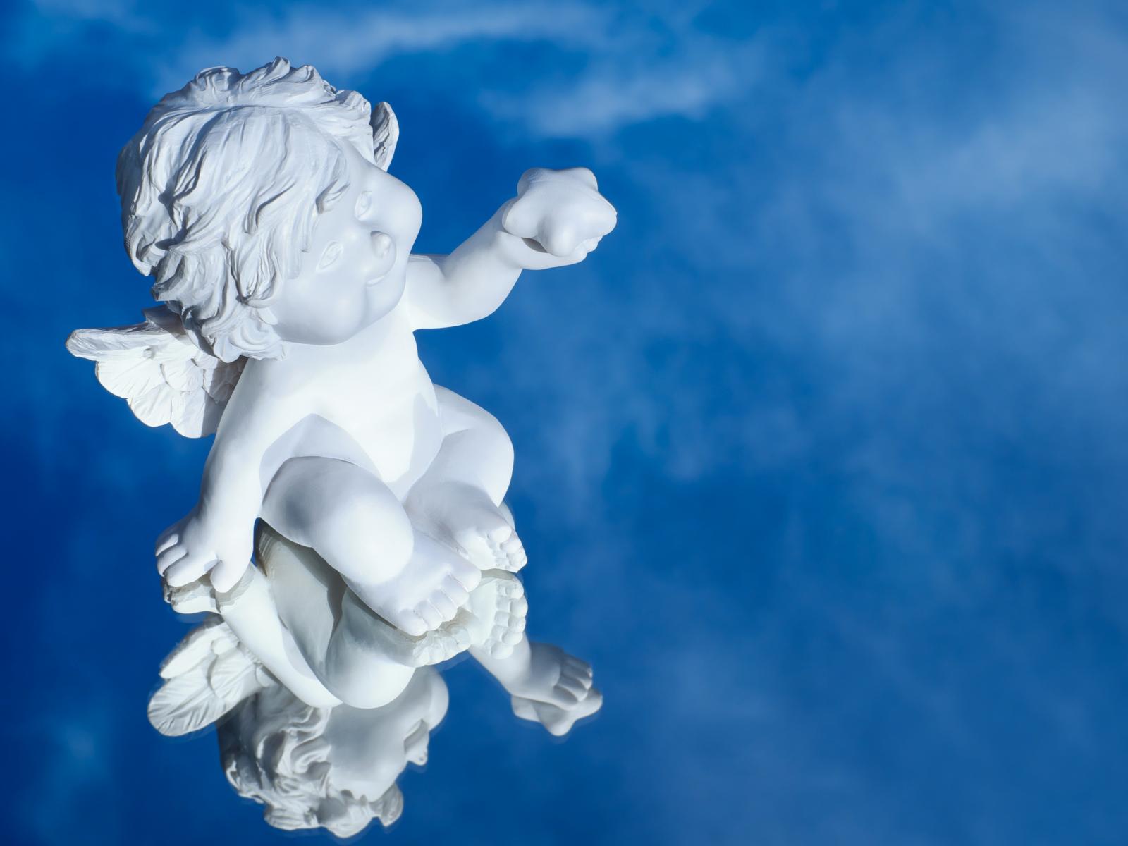 Обои Маленькая статуя купидона отражается в голубой поверхности