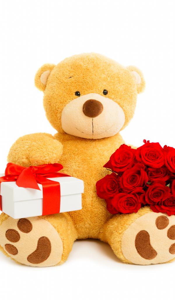 Обои Плюшевый медведь с букетом красных роз и подарком