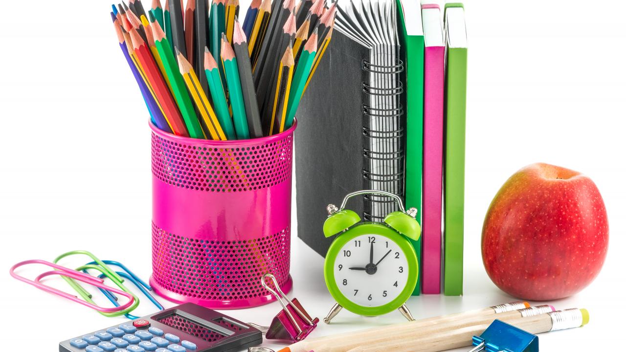 Обои Канцелярские товары и красное яблоко на белом фоне