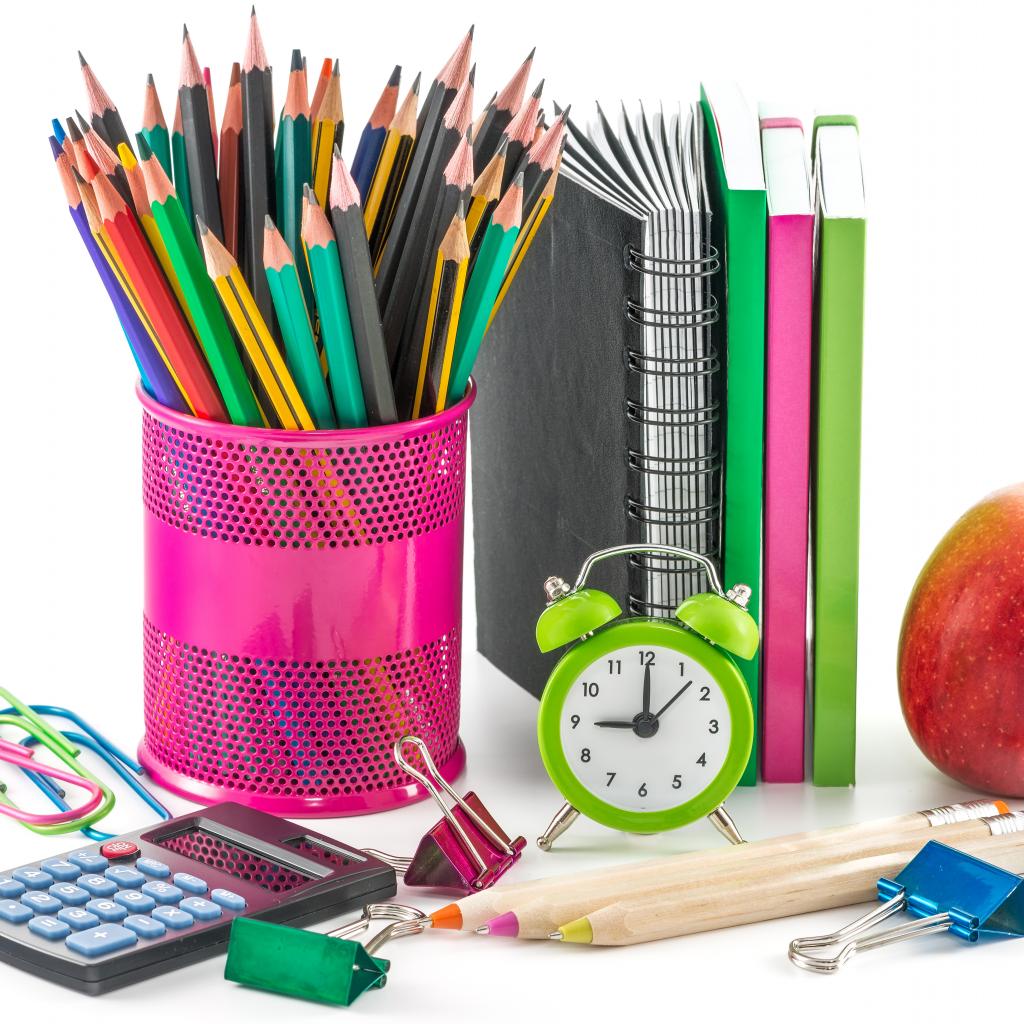 Обои Канцелярские товары и красное яблоко на белом фоне