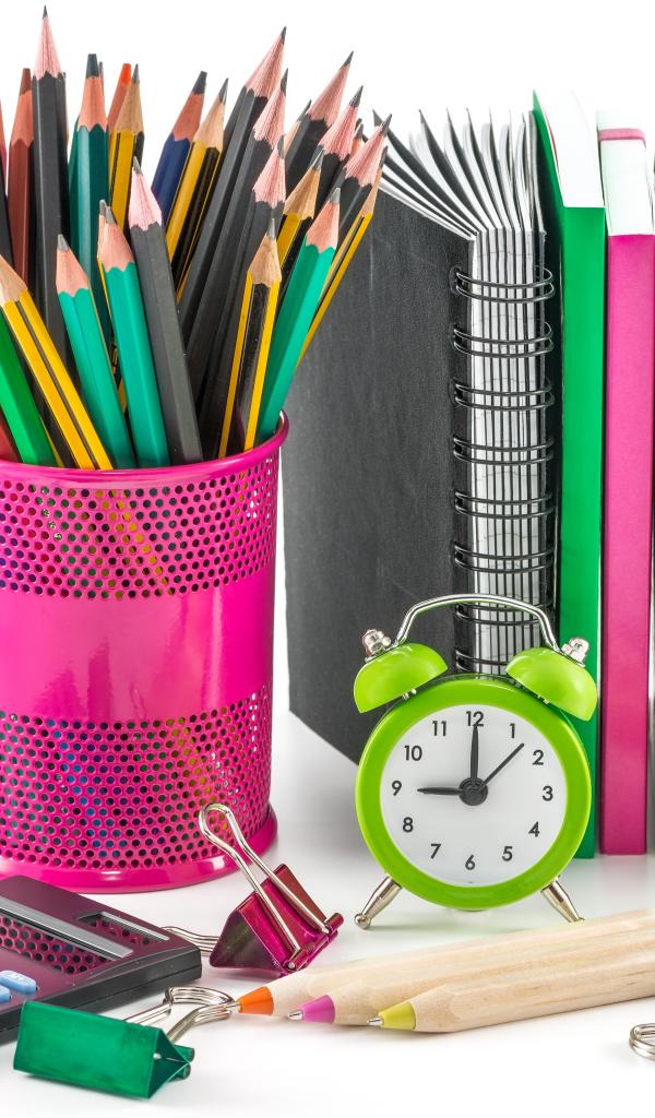 Обои Канцелярские товары и красное яблоко на белом фоне