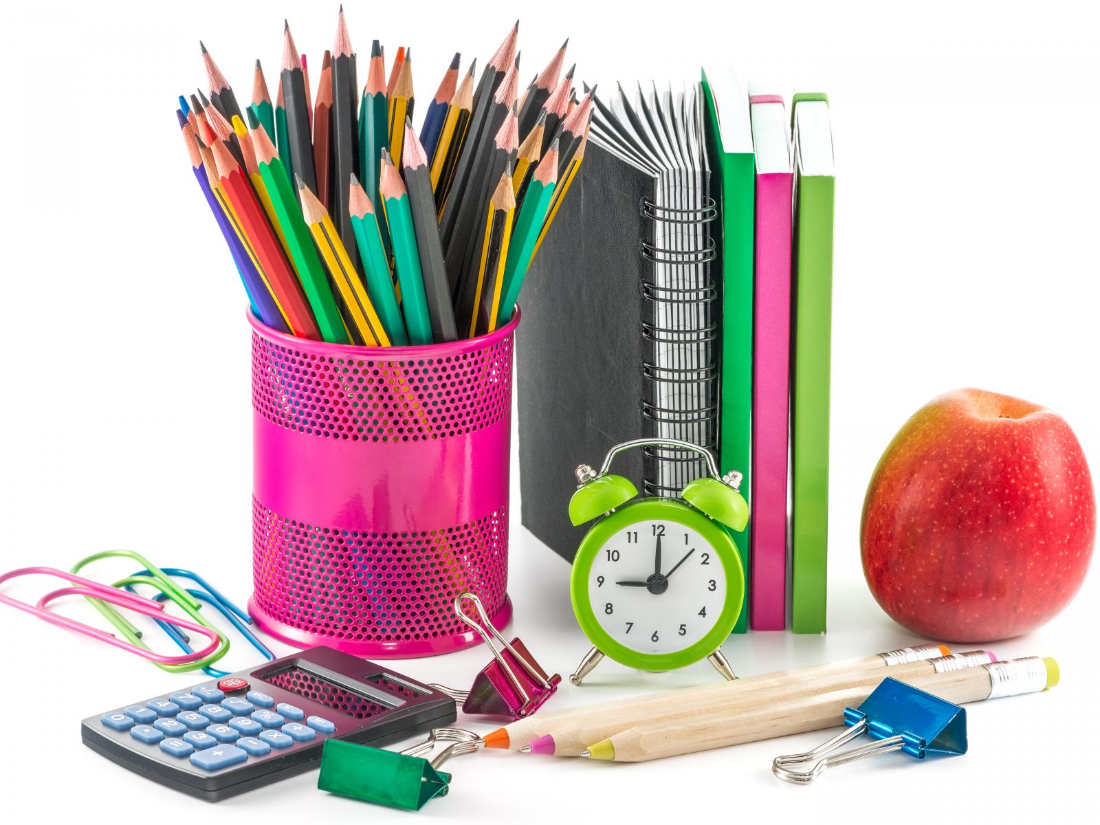 Обои Канцелярские товары и красное яблоко на белом фоне