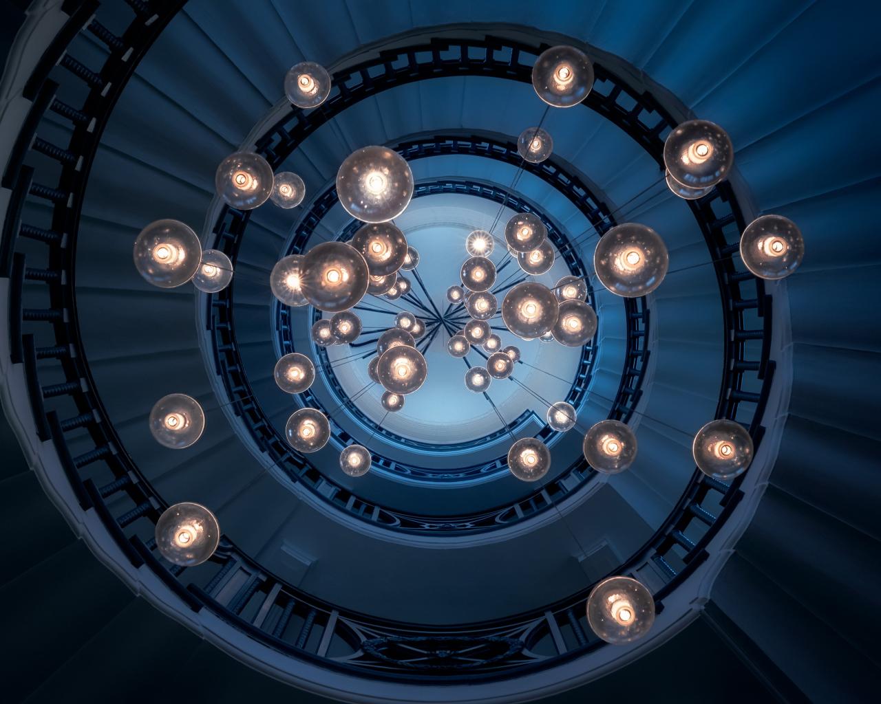 Обои Большая люстра с висячими лампочками над лестницей
