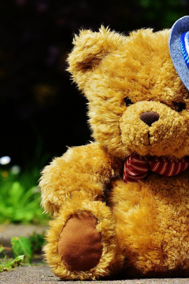 Обои Плюшевый медведь в шляпке сидит на дороге