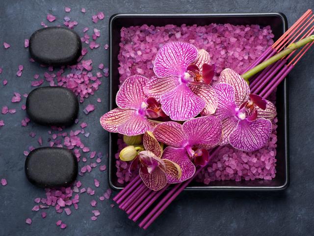 Обои Цветы орхидеи с ароматическими палочками, камнями и солью