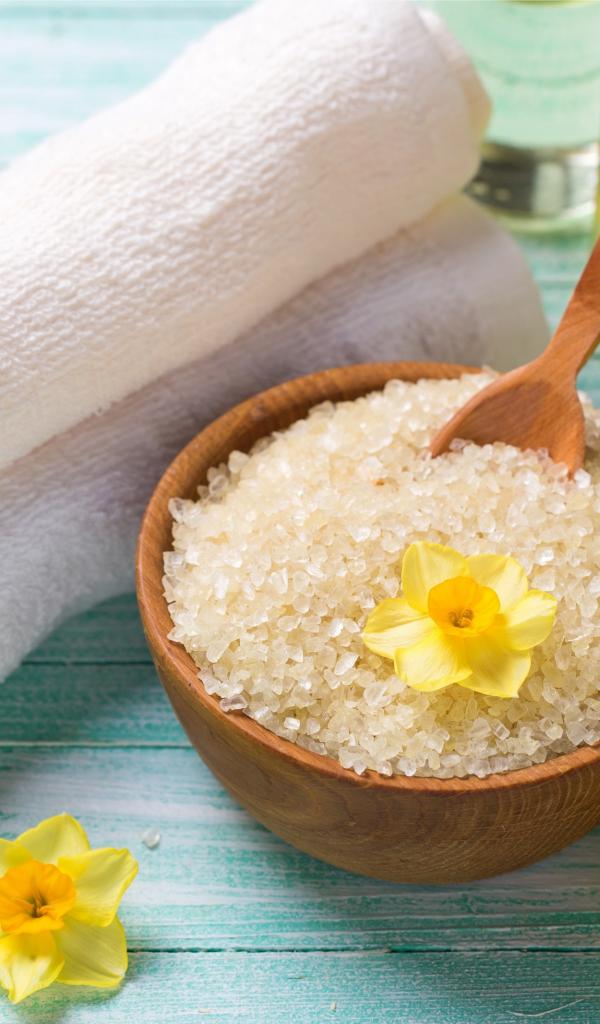 Обои Соль с цветами нарцисса и полотенцем на столе
