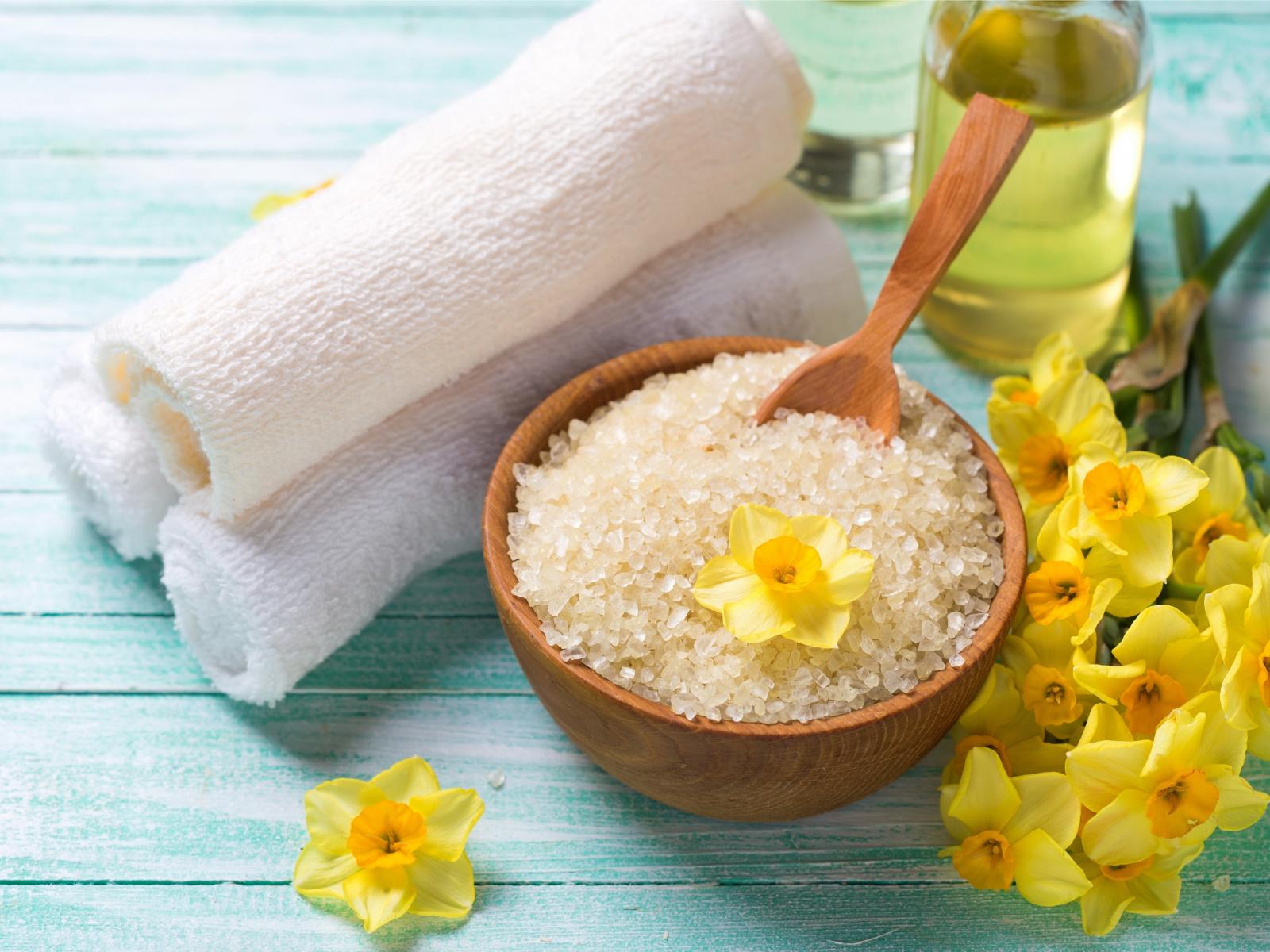 Обои Соль с цветами нарцисса и полотенцем на столе