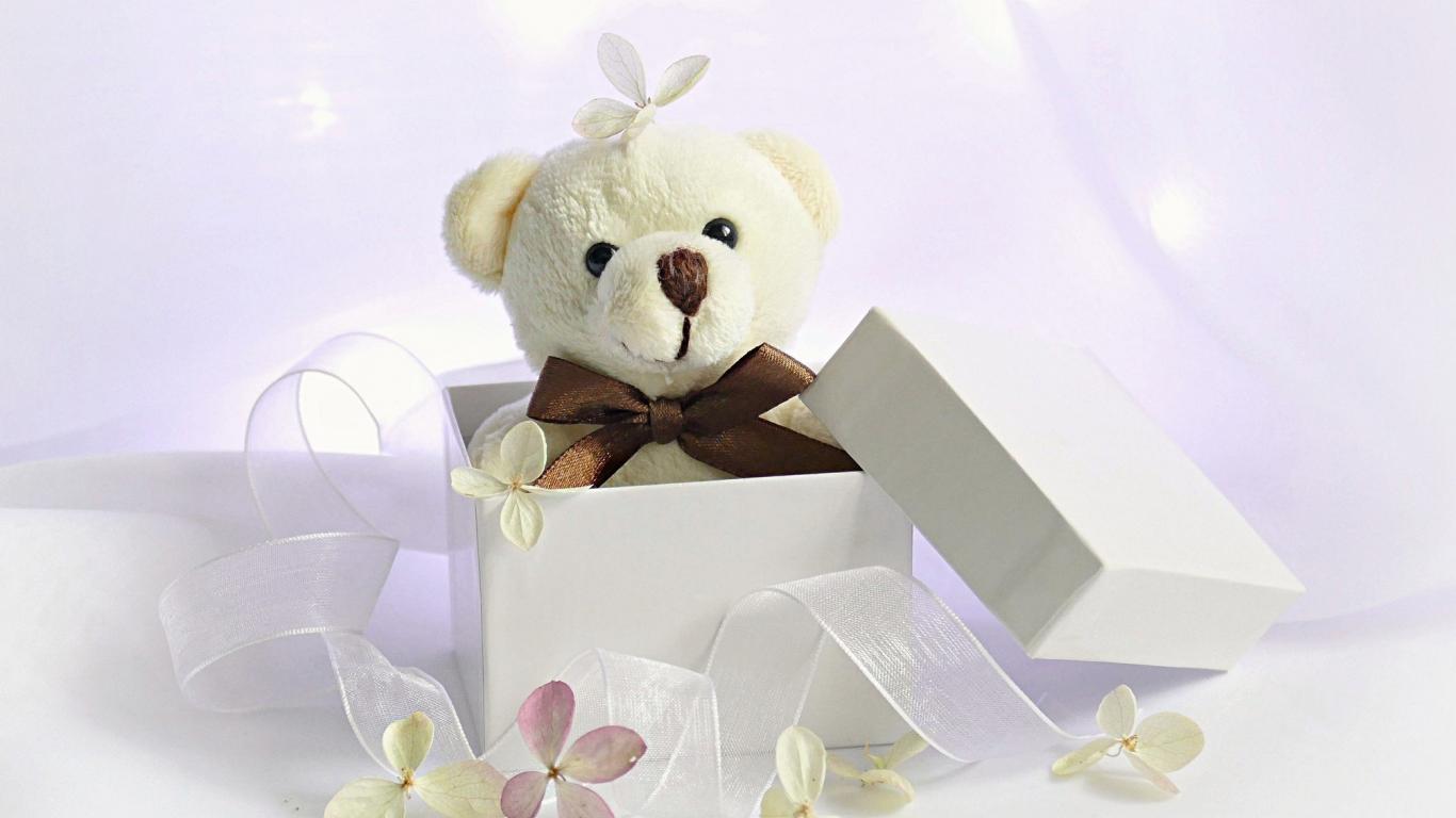 Обои Белый плюшевый медведь в подарочной коробке