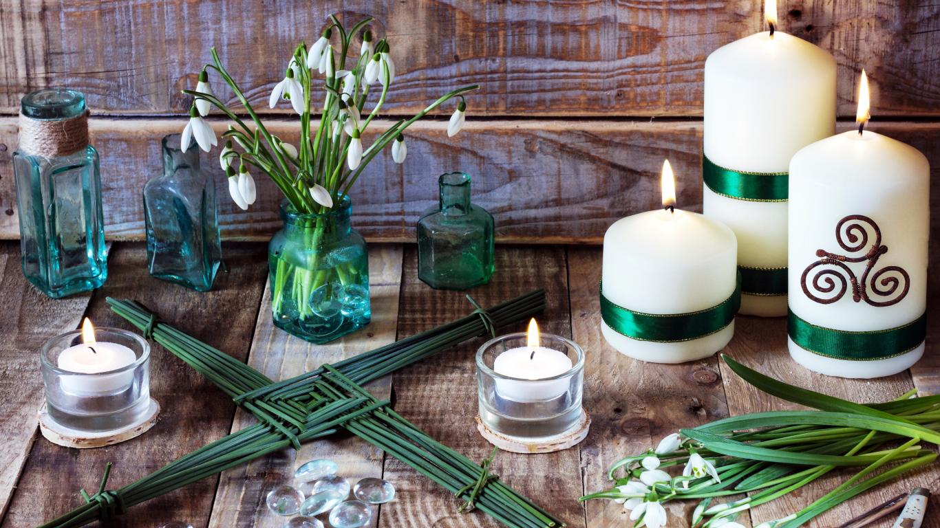 Обои Букет подснежников на столе с зажженными свечами