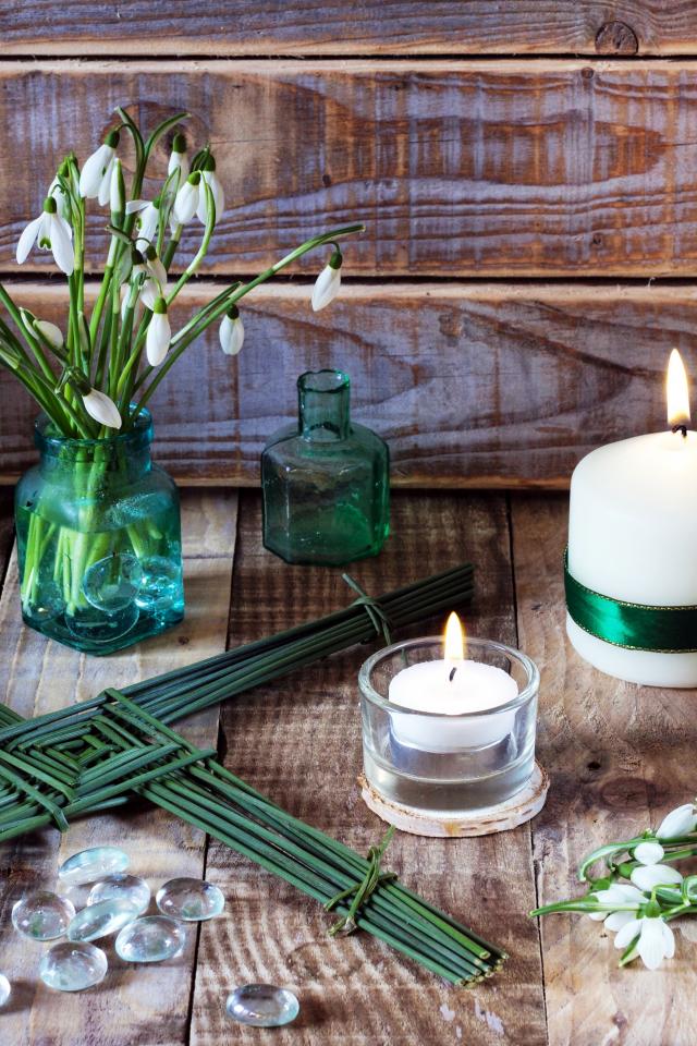Обои Букет подснежников на столе с зажженными свечами