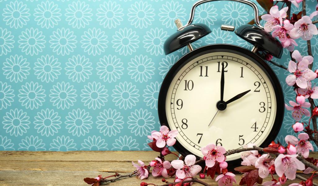 Обои Черный будильник на голубом фоне с цветами абрикоса