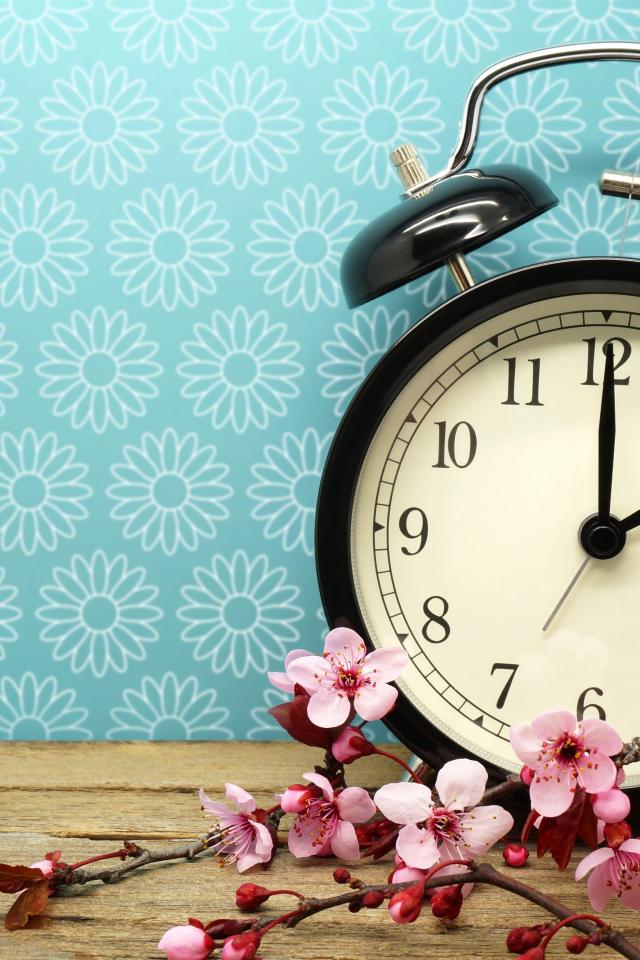 Обои Черный будильник на голубом фоне с цветами абрикоса