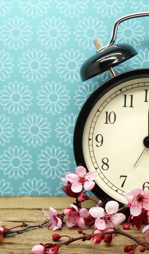 Обои Черный будильник на голубом фоне с цветами абрикоса