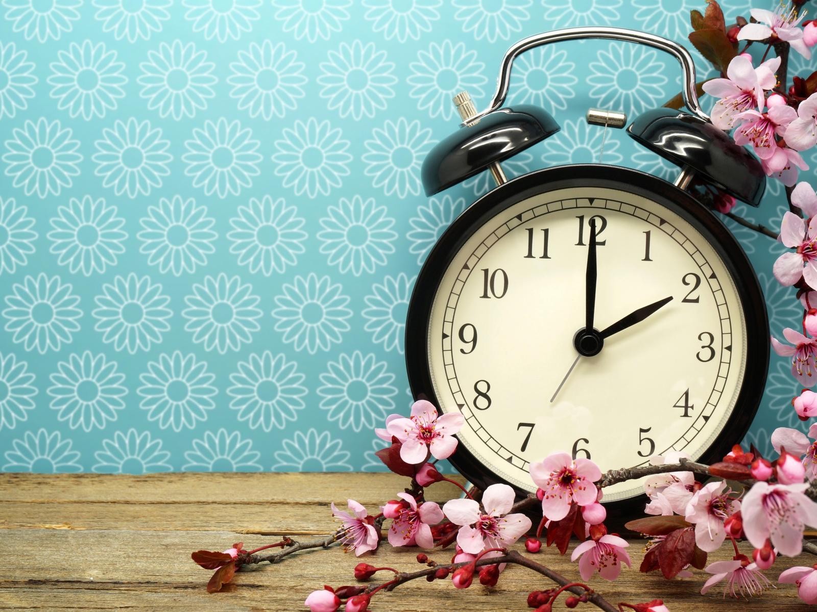 Обои Черный будильник на голубом фоне с цветами абрикоса