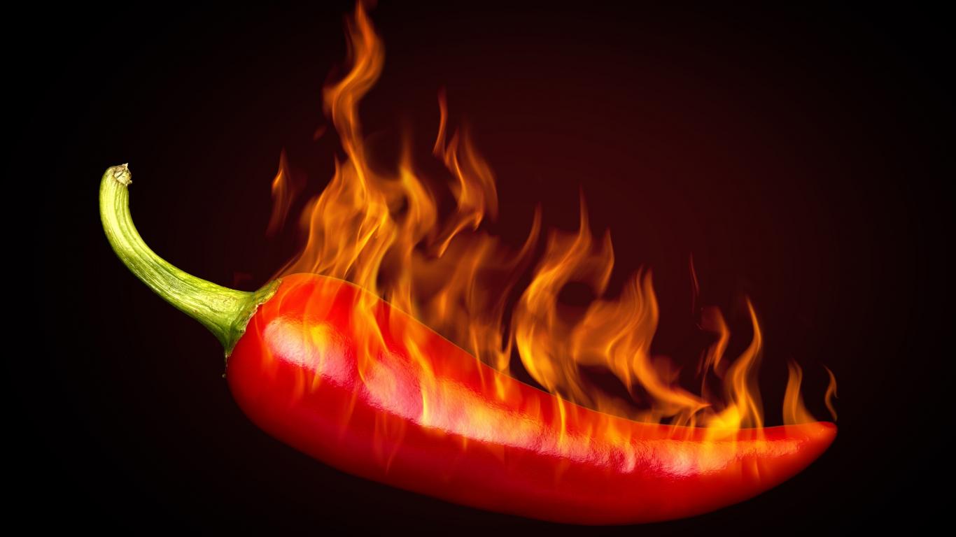 Обои Красный острый перец обнимает бутылку на сером фоне