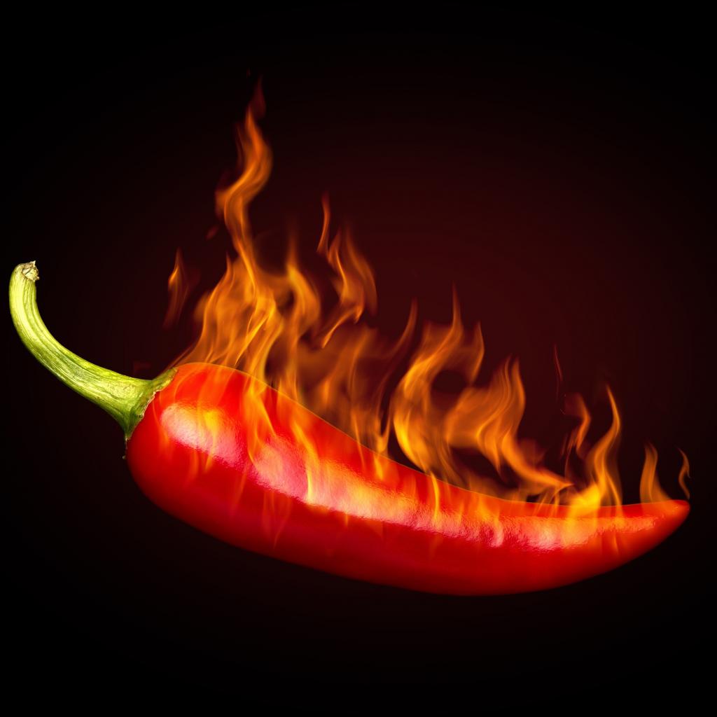 Обои Красный перец с пламенем на черном фоне