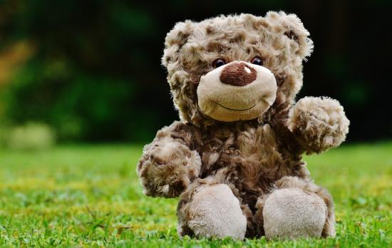 Обои Милый плюшевый мишка сидит на зеленой траве