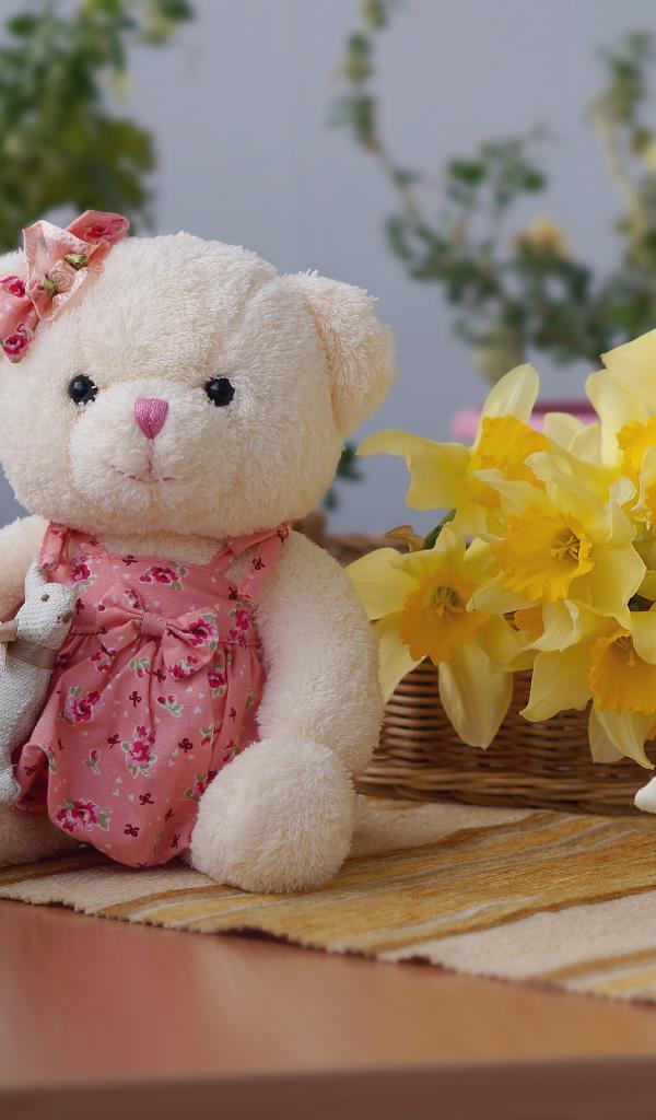 Обои Плюшевый мишка на столе с букетов нарциссов