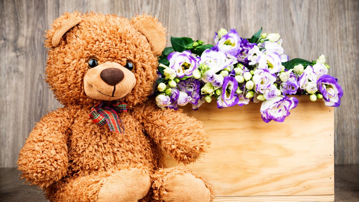 Обои Плюшевый мишка с букетом цветов на деревянном фоне