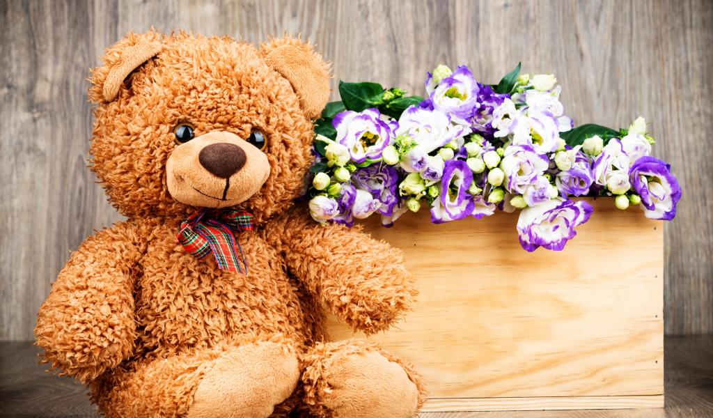 Обои Плюшевый мишка с букетом цветов на деревянном фоне