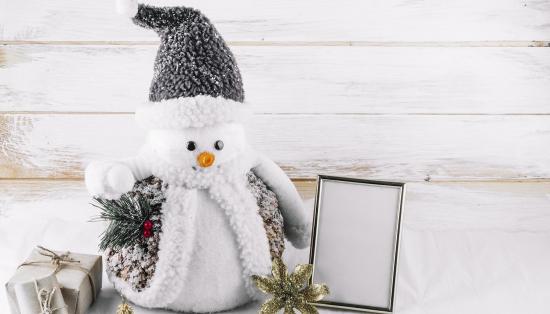 Обои Большой игрушечный снеговик на деревянном фоне