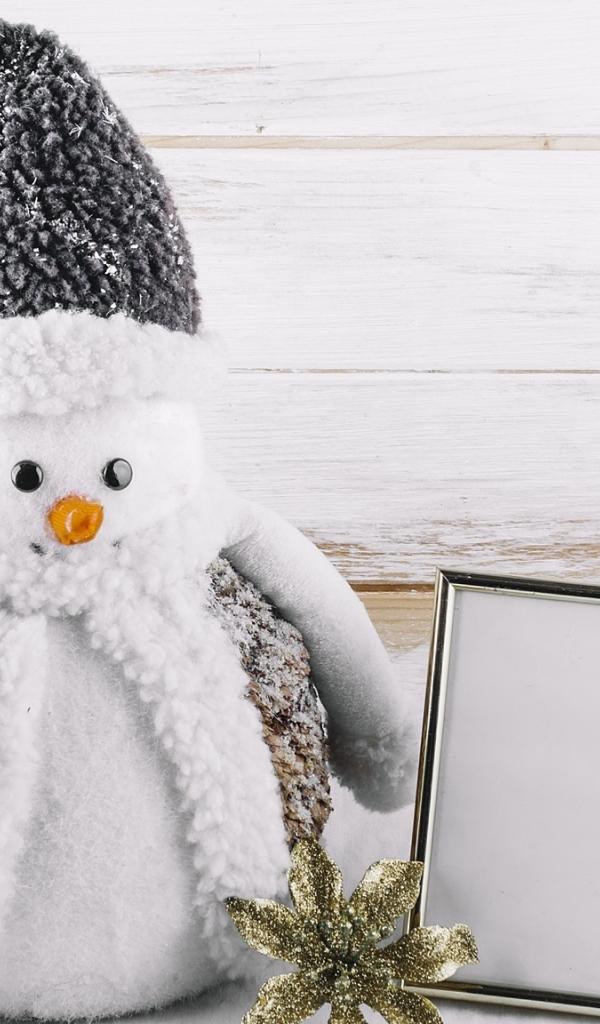 Обои Большой игрушечный снеговик на деревянном фоне